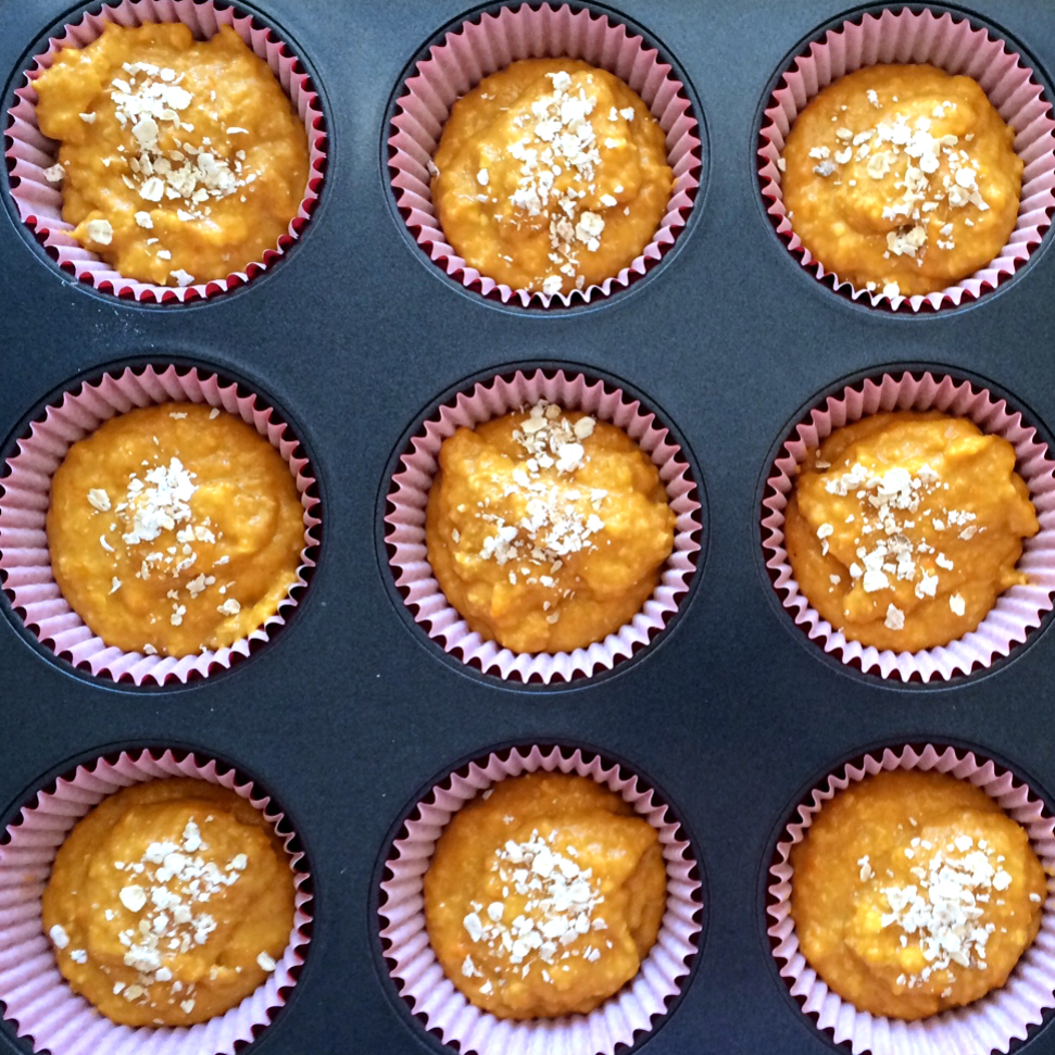- Sprinkle a tiny bit of oats over the top and then bake for roughly 20 minutes. Always good to take one out and test – the usual way is with a toothpick & see if it comes out clean but I use this as an excuse to cut one open and give it a proper taste. If it’s still too doughy then just leave them in there for another few minutes – not too long!
